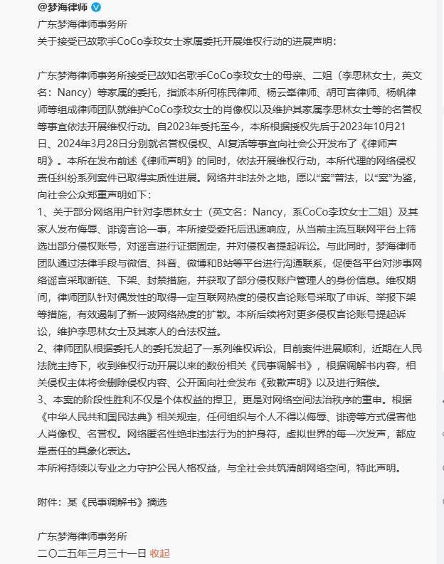 李玟二姐李思林转发律师事务所声明,证实她针对部分网友侮辱诽谤自己及家人的维权案胜诉啦!李思林还霸气配文:“面对网络暴力,谁都不用怕!正义或许会姗姗来迟,但绝不会缺席!”